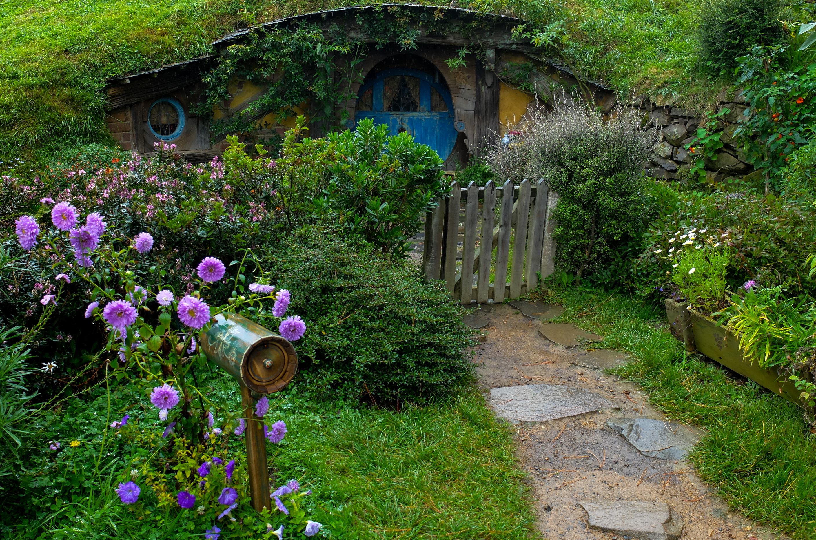 What is there to see? Nicely manicured gardens and pretty hobbit houses. You canβt go inside, which is a shame. Unfortunately Bilbo Baggins wasn’t in when we were at his door, perhaps on party business?